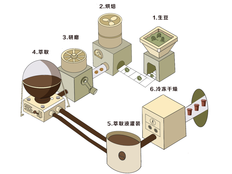 凍干咖啡工廠一般由原料車(chē)間、烘焙車(chē)間、掛耳車(chē)間、提取濃縮車(chē)間、凍干車(chē)間、包裝車(chē)間等功能車(chē)間組成。 一般配置有咖啡豆處理設(shè)備、咖啡萃取設(shè)備、濃縮設(shè)備、冷凍設(shè)備、真空冷凍干燥設(shè)備、粉碎與包裝設(shè)備、質(zhì)量檢測(cè)設(shè)備等。
