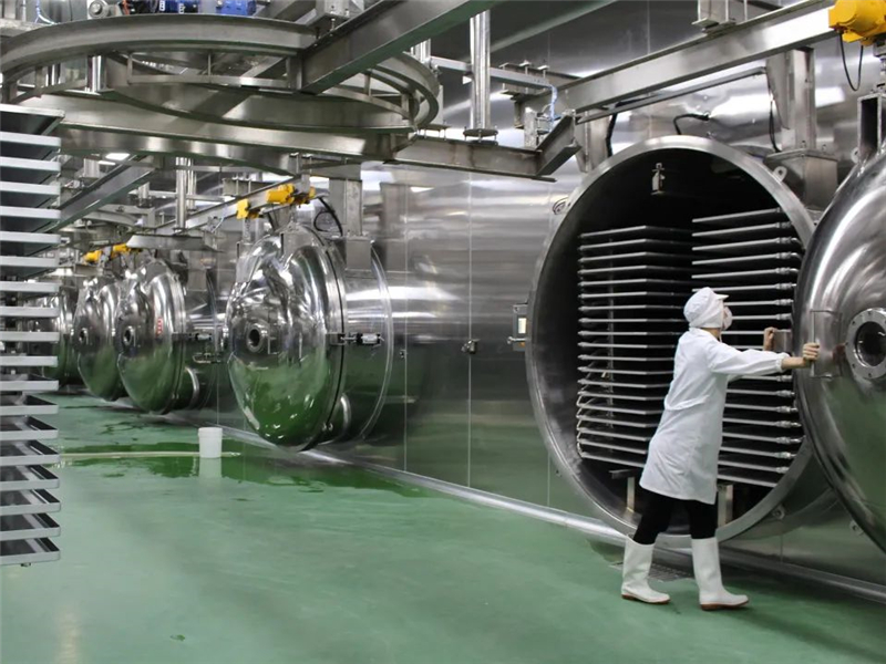 凍干工廠一般由粗加工車間、精加工車間、高溫冷藏庫(kù)、低溫冷藏庫(kù)、速凍隧道、凍干設(shè)備間、卸料與包裝車間、車品儲(chǔ)藏庫(kù)等組成。凍干成套設(shè)備一般由凍干倉(cāng)、控制系統(tǒng)、加熱系統(tǒng)、物料運(yùn)輸系統(tǒng)、制冷系統(tǒng)、冷卻水系統(tǒng)、氣動(dòng)系統(tǒng)、真空系統(tǒng)組成。公司擁有30年的技術(shù)積累,在食品凍干領(lǐng)域擁有50%以上的市場(chǎng)占有率,為全球知名的凍干工廠提供全套的設(shè)備及自動(dòng)化配套,可以提供不同型號(hào)的設(shè)備,裝料重量從300kgs~2500kgs均可定制。交貨周期和安裝調(diào)試周期可按客戶要求制定,售后團(tuán)隊(duì)專業(yè)、反應(yīng)迅速。